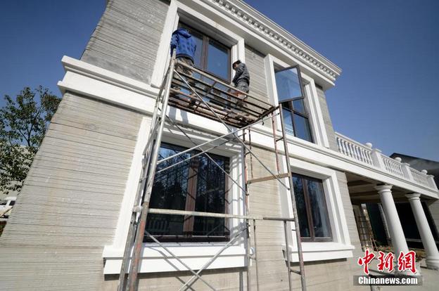 1月19日,工人正在3D打印别墅外部进行施工。