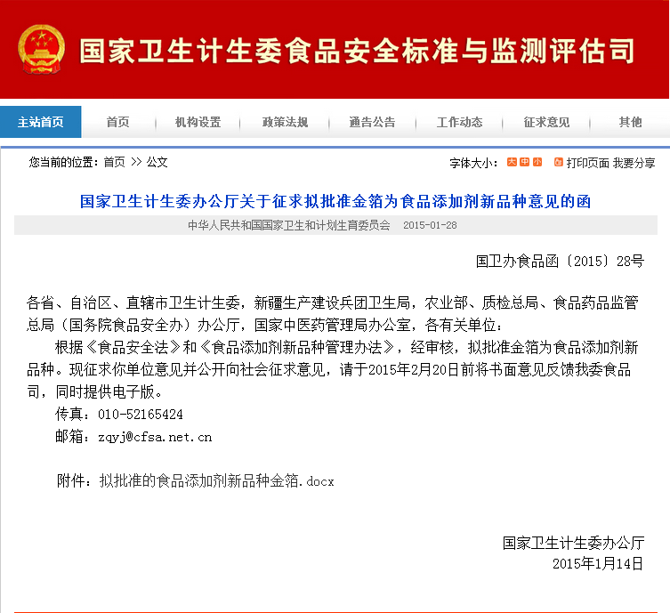 记者昨天注意到,国家卫计委官网近日刊登了《国家卫生计生委办公厅关于征求拟批准金箔为食品添加剂新品种意见的函》,函件称,经审核,拟批准金箔为食品添加剂新品种,现已开始征求各相关单位意见并向社会征求意见,时间截止到2月20日。