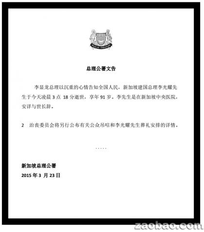 新华社快讯:据新加坡总理公署23日公告,新加坡前总理李光耀因病于当天凌晨3时18分点去世,享年91岁。