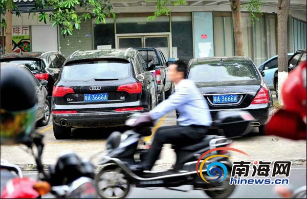 南海网海口3月23日消息(南海网记者 陈丽娜) 近日,一张热心网友所拍下的照片在朋友圈里热传。南海网记者看到图片中一辆琼A·3666A的“靓号”车牌同时挂在了价值百万元的奥迪Q7上以及一辆奔驰车上,更让人费解的是任性车主竟然将两辆车紧挨停放。截至记者发稿从,交警部门获悉,该车牌所属车辆品牌为奥迪,奔驰车涉嫌套牌,而对于照片内的奥迪越野车是否套牌仍须进一步调查。