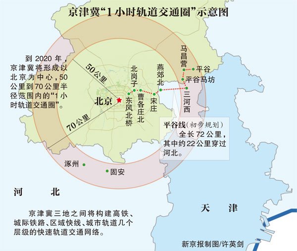 到2020年,以北京为中心,50公里到70公里半径范围内,京津冀将形成“1小时轨道交通圈”。其中,将建成约1000公里区域快线连通京津冀三地。北京市交通委主任周正宇表示,首条区域快线敲定为平谷线,其将成为京津冀三地区域快线的样板线,有望方便百余万人出行。