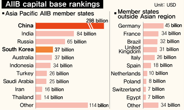 《韩国经济》28日则披露称,出资29.7%的中国投票权预计在25%以上,印度、俄罗斯、德国分别出资8.3%、6.5%和4.4%,韩国的出资比例和投票权分别是3.74%和3.5%。