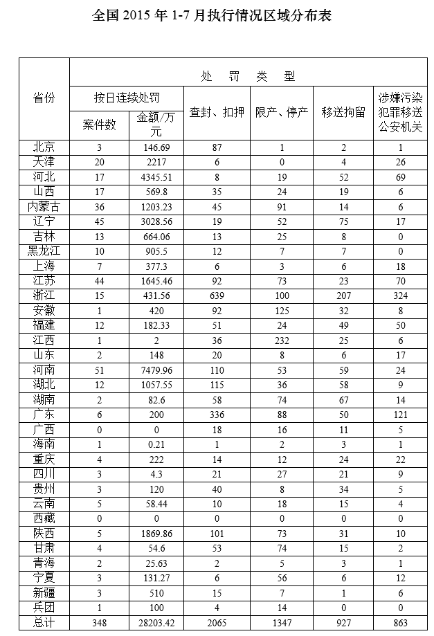 邹首民说,前7月,河南实施按日连续处罚51件,罚款金额共计7479.96万元;辽宁实施按日连续处罚45件,罚款金额共计3028.56万元;江苏实施按日连续处罚44件,罚款金额共计1645.46万元;内蒙古实施按日连续处罚36件,罚款金额共计1203.23万元;河北实施按日连续处罚17件,罚款金额共计4345.51万元。浙江实施查封、扣押639件,占全国查封、扣押案件总数近三分之一,移送行政拘留207件,移送涉嫌环境污染犯罪案件324件。广东省实施查封、扣押336件。江西省实施限产停产232件。与6月情况相比,7月适用按日连续处罚、移送行政拘留及涉嫌环境污染犯罪案件数基本持平,适用限产停产案件数上升44.0%,查封扣押案件数下降21.7%。